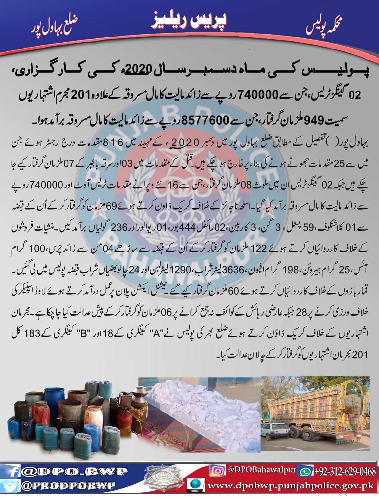 پولیس کی ماہ دسمبر سال 2020ء کی کارگزاری، 02 گینگز ٹریس،201مجرم اشتہاریوں سمیت 494ملزمان گرفتار جن سے لاکھوں رولپے مالیت کا مال مسروقہ برآمد