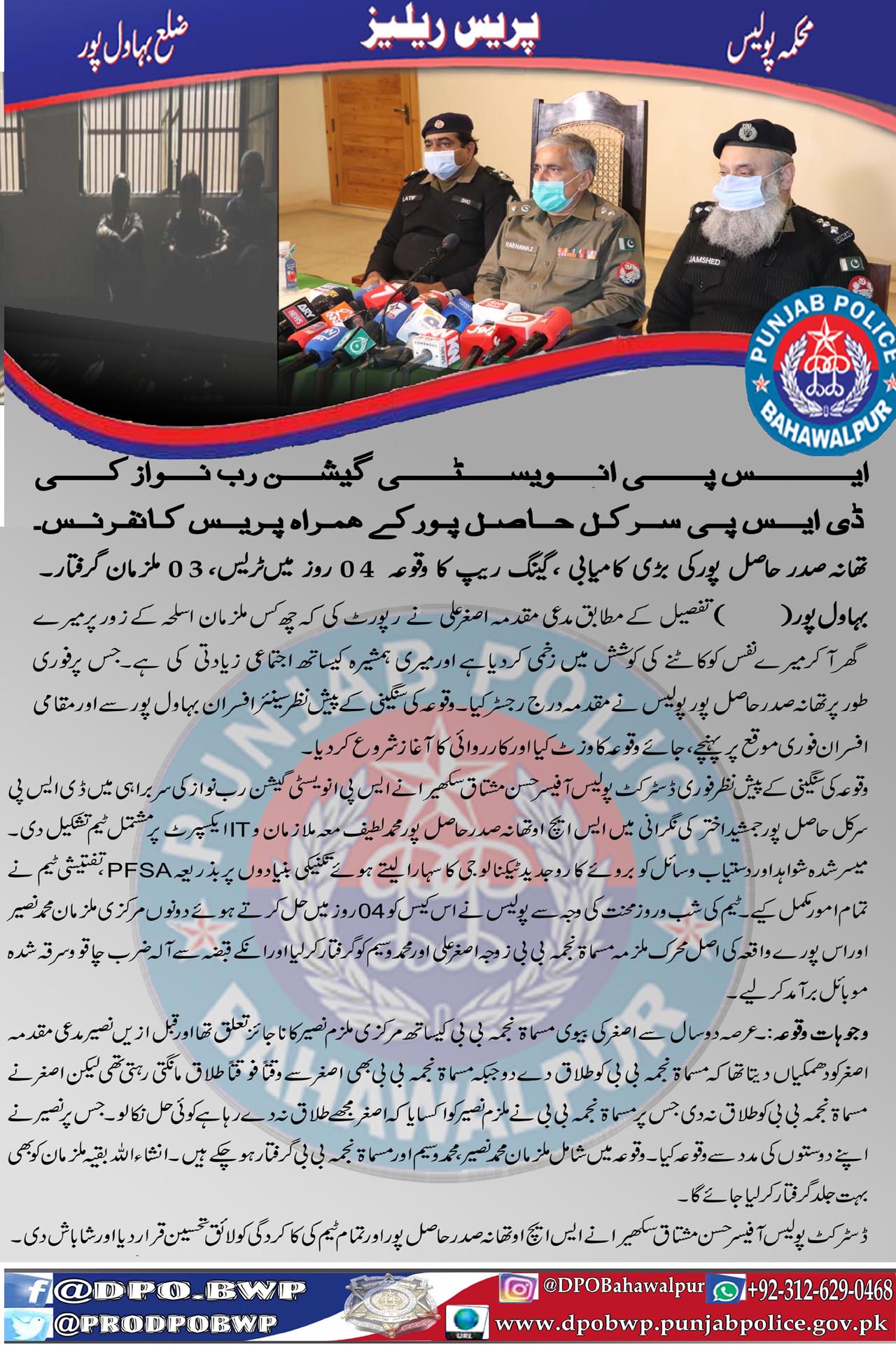 ایس پی انستی گیشن رب نواز تلہ کی ڈی ایس پی حاصل پور سرکل کے ہمراہ پریس کانفرنس تھانہ صدر پولیس کی بڑی کامیابی ، گینگ ریپ کا وقوعہ 04 روز میں ٹریس ، 03 ملزمان گرفتار۔