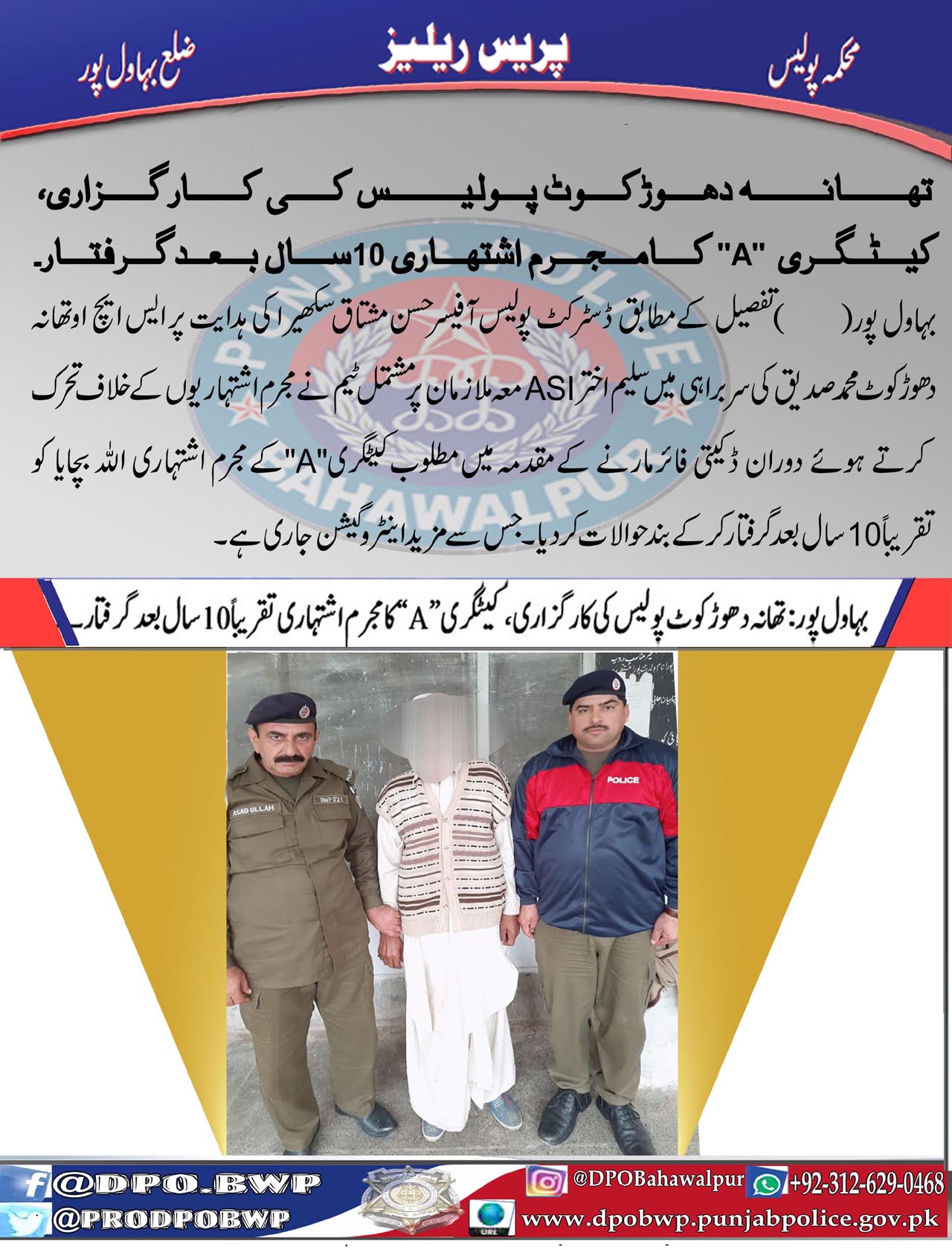 تھانہ دھوڑکوٹ پولیس کی کارگزاری ، کیٹگری "اے" کا مجرم اشتہاری 10سال بعد گرفتار۔ ۔