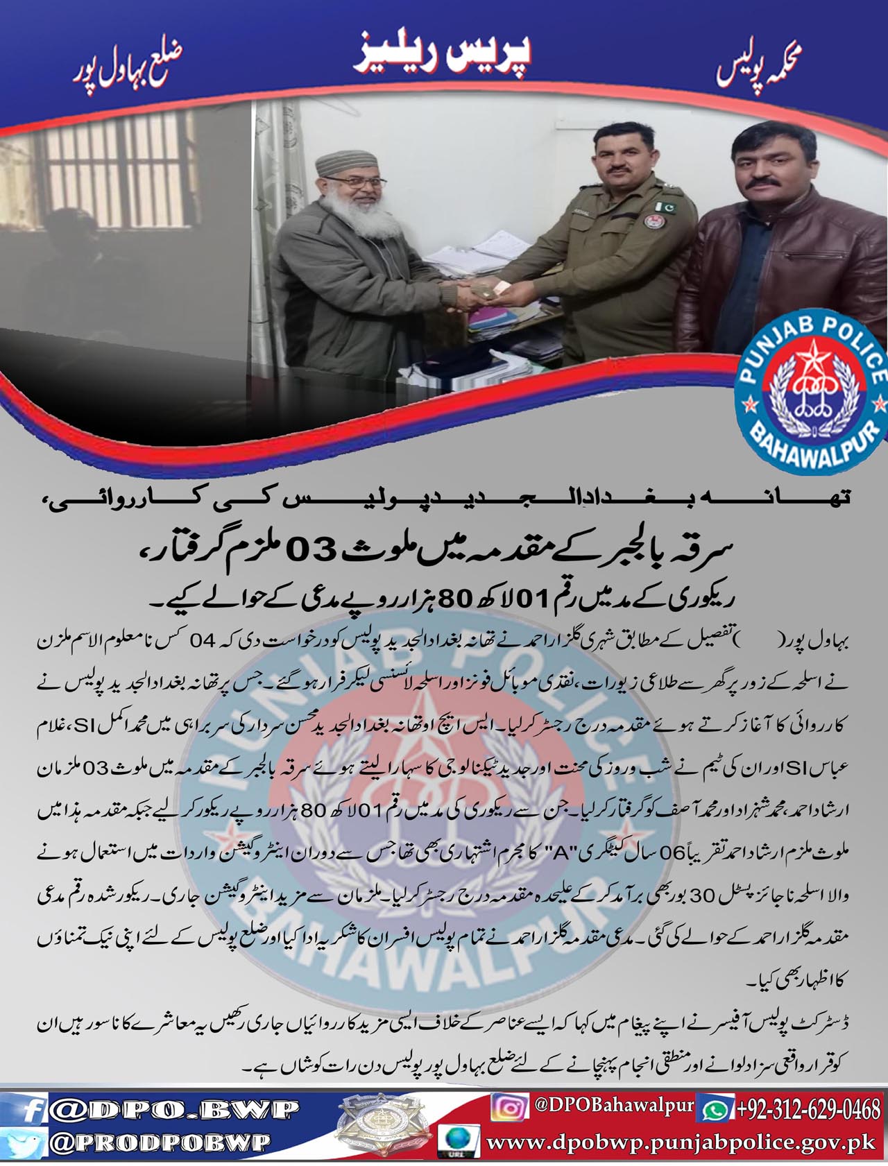 تھانہ بغداد الجدید پولیس کی کارروائی، سرقہ بالجبر کے مقدمہ میں ملوث 03 ملزم گرفتار، ریکوری کے مد میں 01 لاکھ 80ہزا ر روپے مدعی کے حوالے کیے۔ ۔