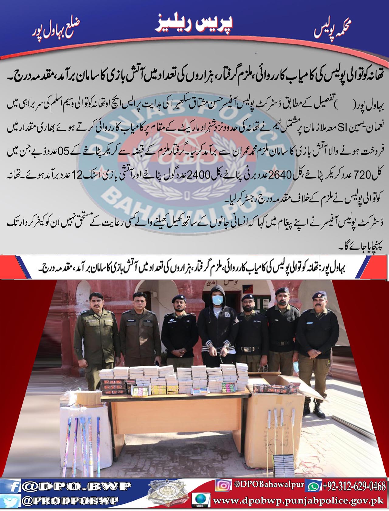 تھانہ کوتوالی پولیس کی کامیاب کارروائی، ہزاروں کی تعداد مین آتش بازی کا سامان برآمد، ملزم گرفتار، مقدمہ درج۔ ۔