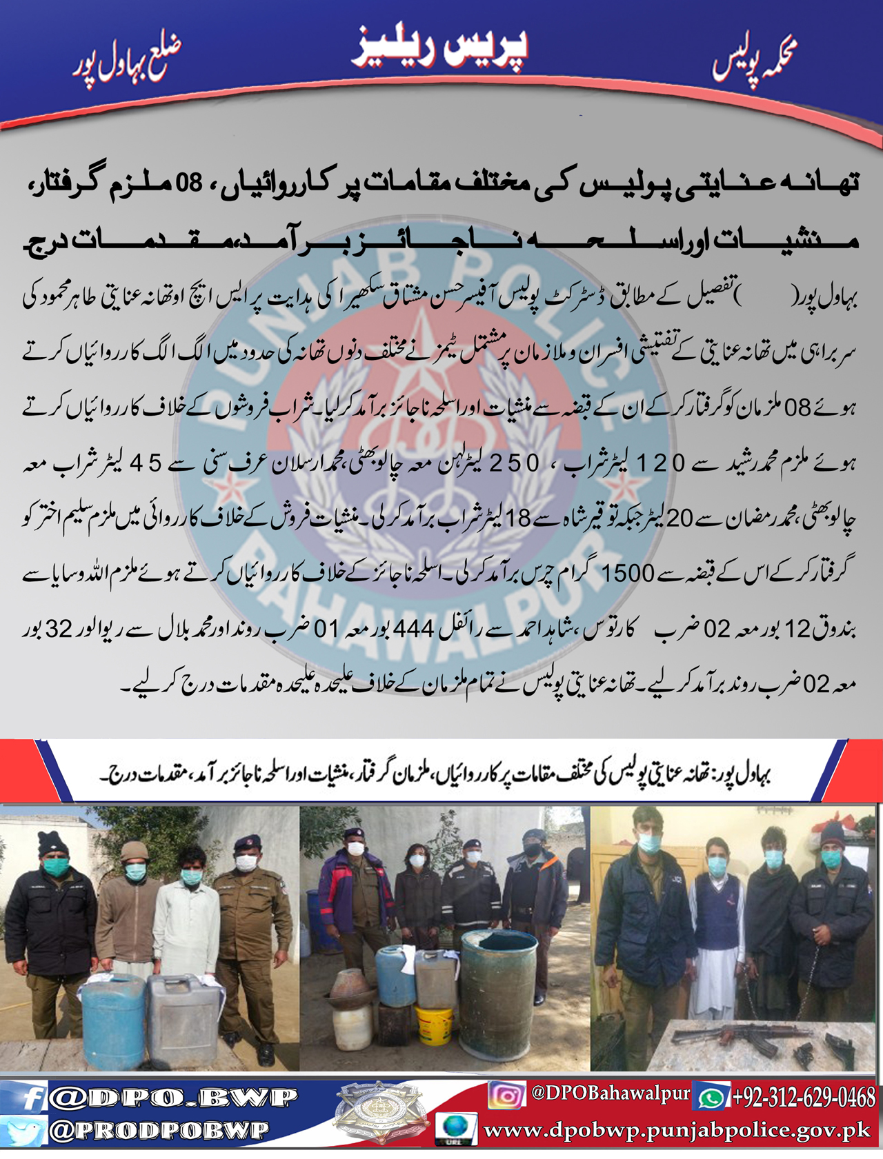 تھانہ عنائتی پولیس کی مختلف مقامات پر کارروائیاں، 08 ملزم گرفتار، منشیات اور اسلحہ ناجائز برآمد، مقدمات درج۔ ۔
