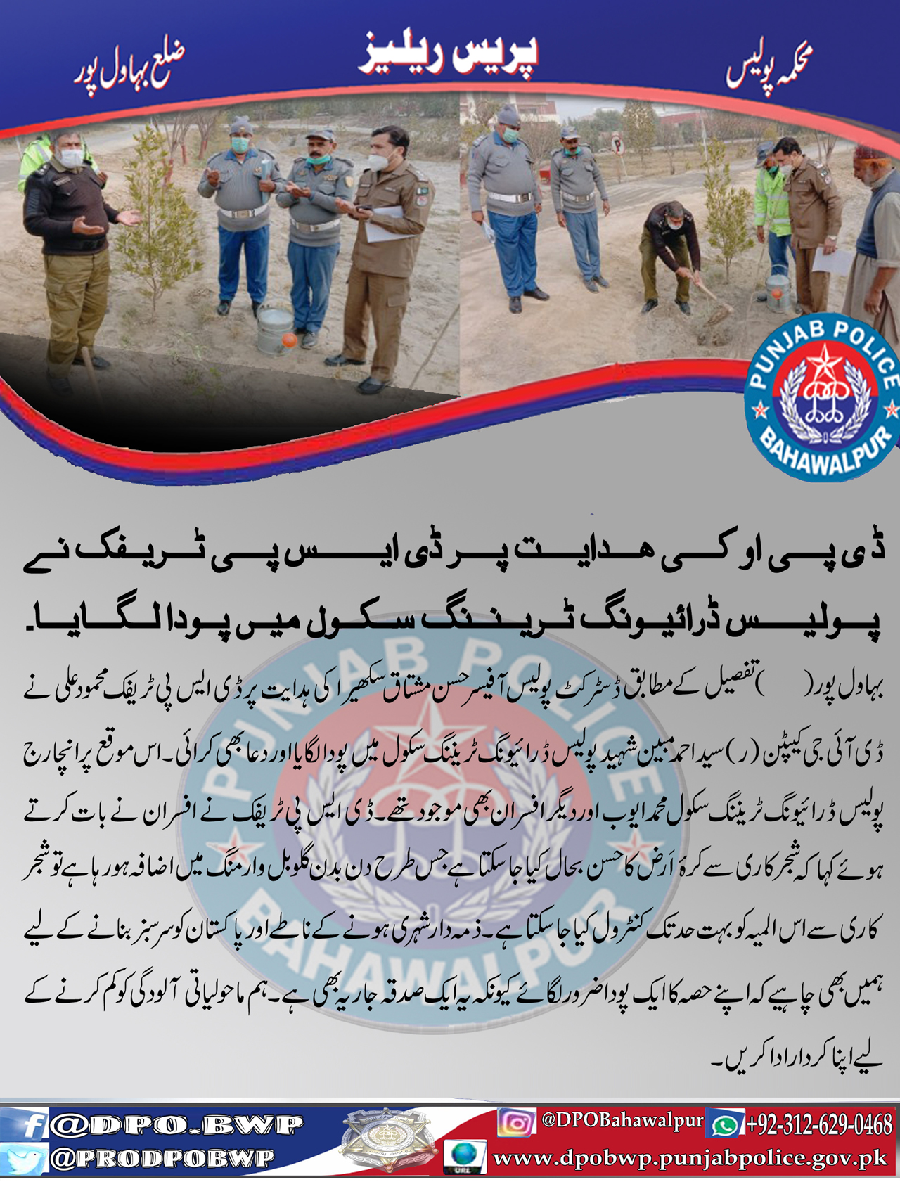 ڈسٹرکٹ پولیس آفیسر کی ہدایت پر ڈی ایس پی ٹریفک نے پولیس ڈرائیونگ ٹریننگ اسکول میں پودا لگایا