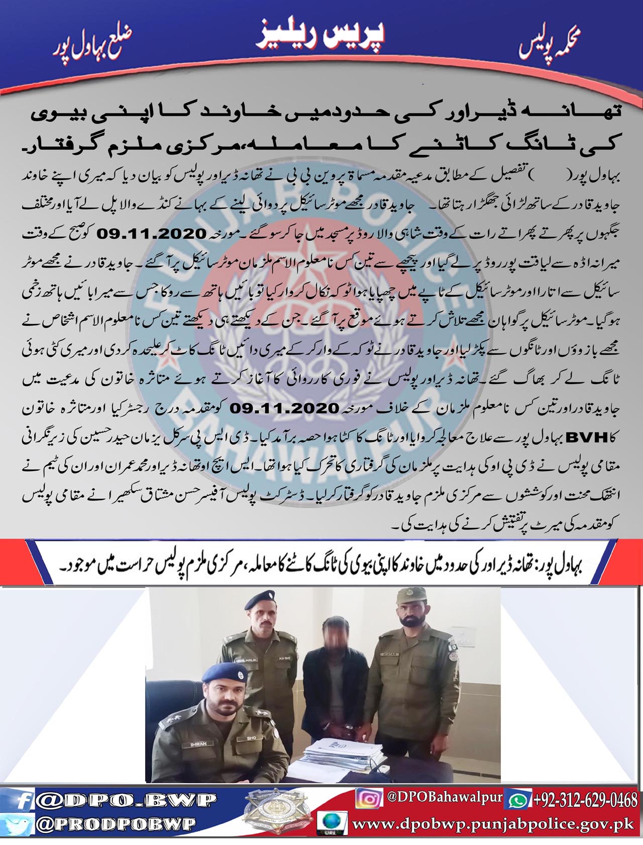 تھانہ ڈیراور کی حدود میں خاوند کا اپنی بیوی کی ٹانگ کاٹنے کا معاملہ ، مرکزی ملزم گرفتار۔