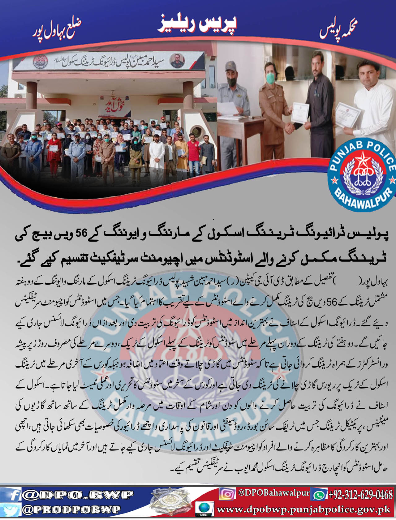 پولیس ڈرائیونگ ٹریننگ اسکول کے مارننگ و ایوننگ کے 56ویں بیج کی ٹریننگ مکمل کرنے والے اسٹوڈنٹس میں اچیومنٹ سرٹیفیکیٹ تقسیم کیے گئے۔