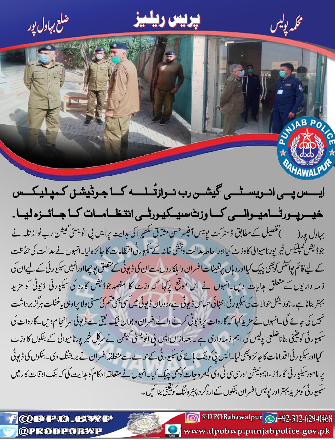 ایس پی انویسٹی گیشن رب نواز تُلہ کا جوڈیشل کمپلیکس خیرپور ٹامیوالی کا وزٹ ، سیکیورٹی انتظامات کا جائزہ لیا۔