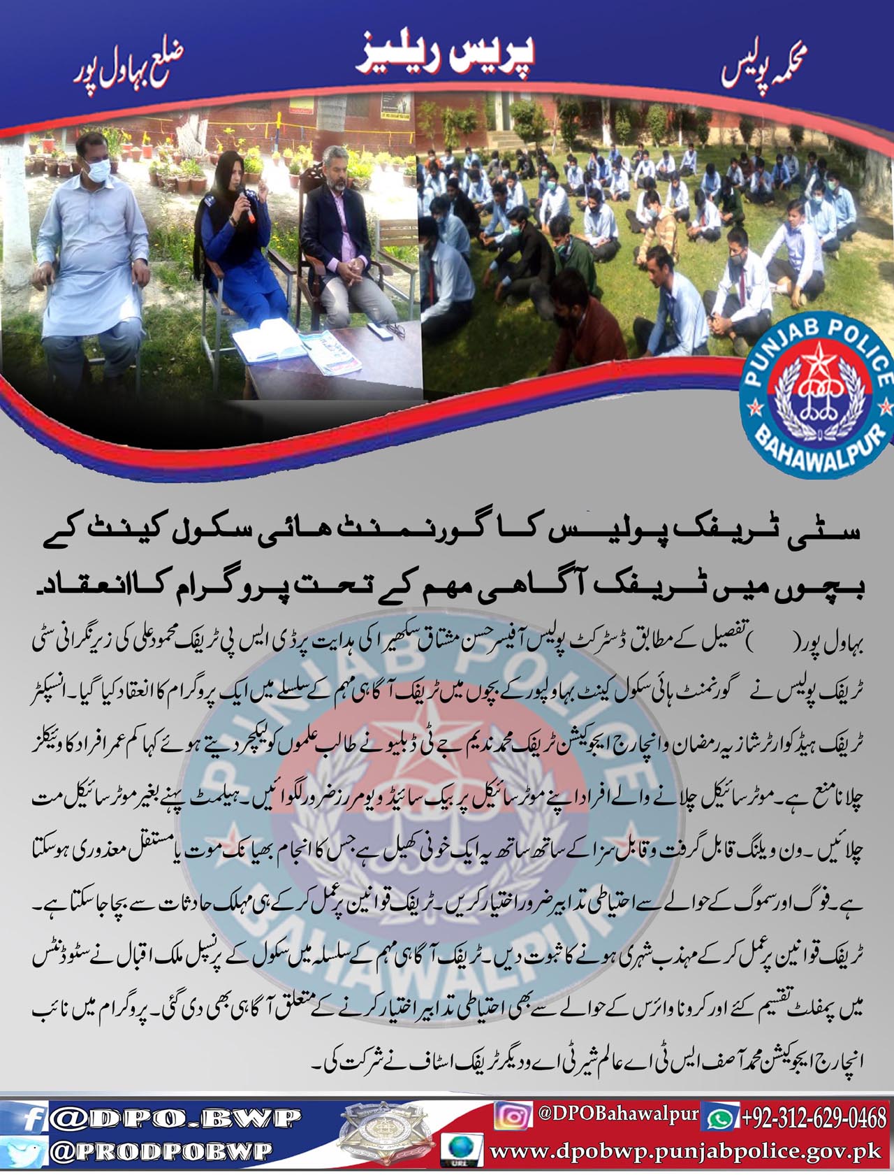سٹی ٹریفک پولیس کا گورنمنٹ ہائی سکول کینٹ کے بچوں میں ٹریفک آگاہی مہم کے تحت پروگرام کا انعقاد۔