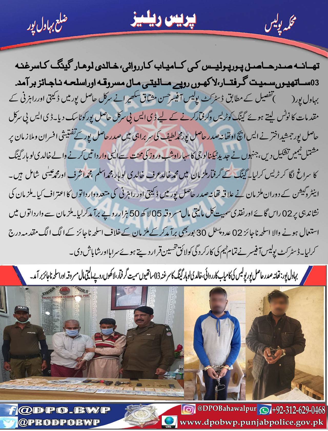 تھانہ صدر حاصل پور پولیس کی کامیاب کارروائی، خالدی لوہار گینگ کاسرغنہ 03ساتھیوںںسمیت گرفتار، لاکھوں روپے مالیتی مال مسروقہ اور اسلحہ ناجائز برآمد۔