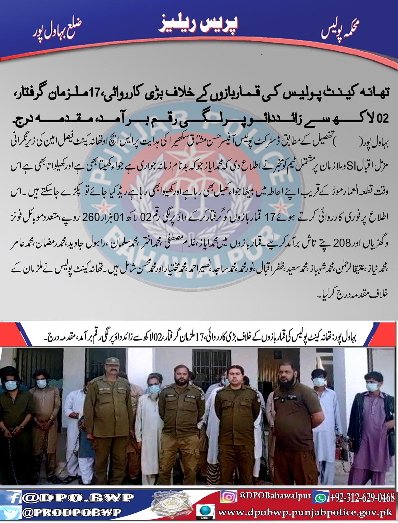 تھانہ کینٹ پولیس کی قمار بازوں کے خلاف بڑی کارروائی، 17ملزم گرفتار، 02لاکھ روپے سے زائد داؤ پر لگی رقم برآمد، مقدمہ درج