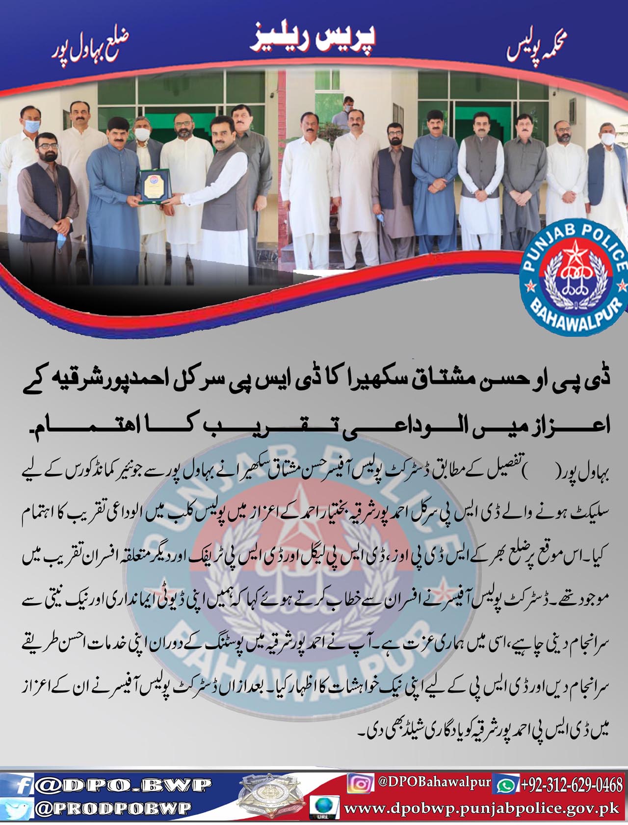 ڈسٹرکٹ پولیس آفیسر حسن مشتاق سکھیرا کا ڈی ایس پی احمدپور شرقیہ کے اعزاز میں الوداعی تقریب کا اہتمام۔