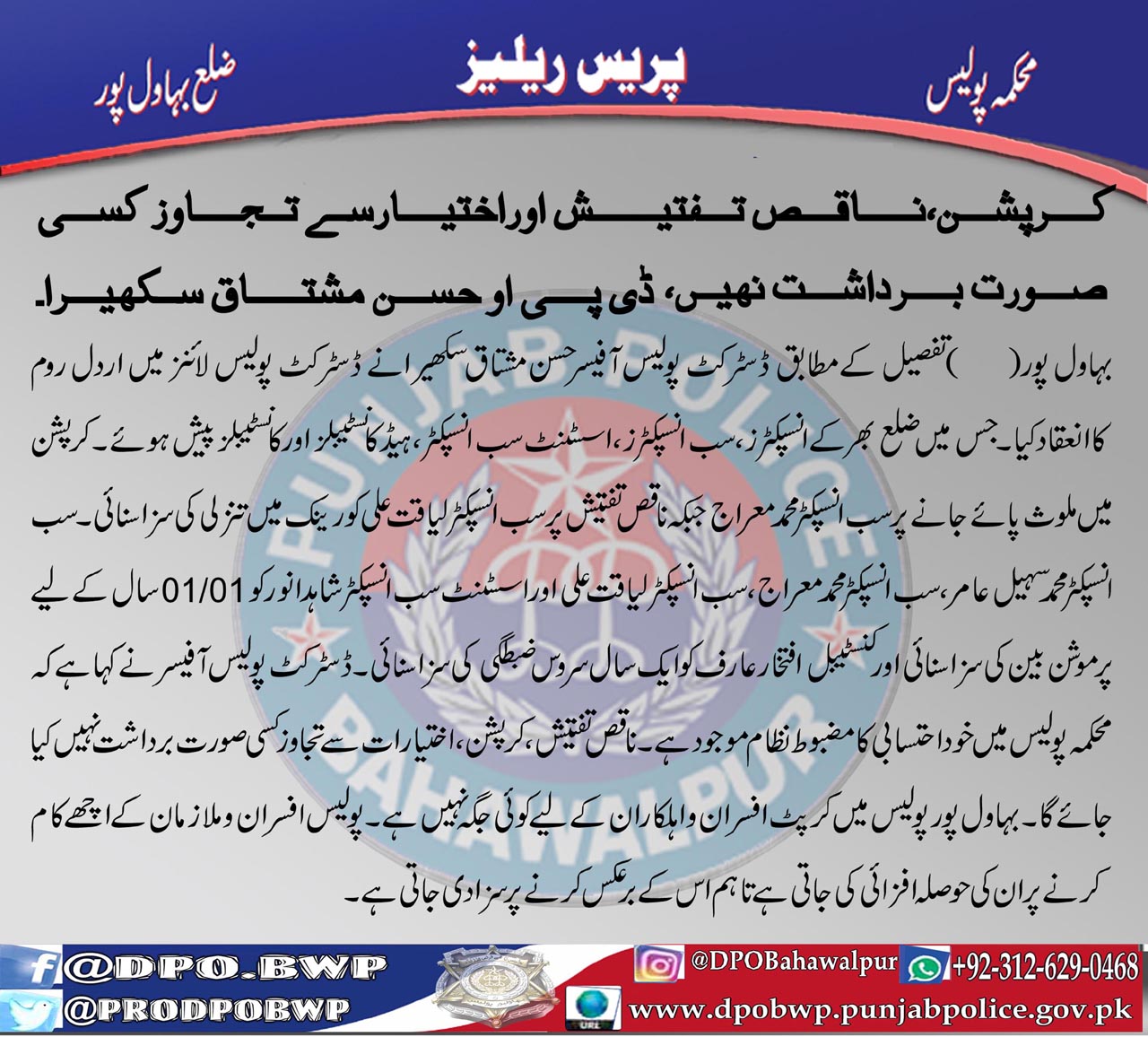 کرپشن ، ناقص تفتیش اور اختیارسے تجاوز کسی صورت میں برداشت نہیں، ڈسٹرکٹ پولیس آفیسر حسن مشتاق سکھیرا۔
