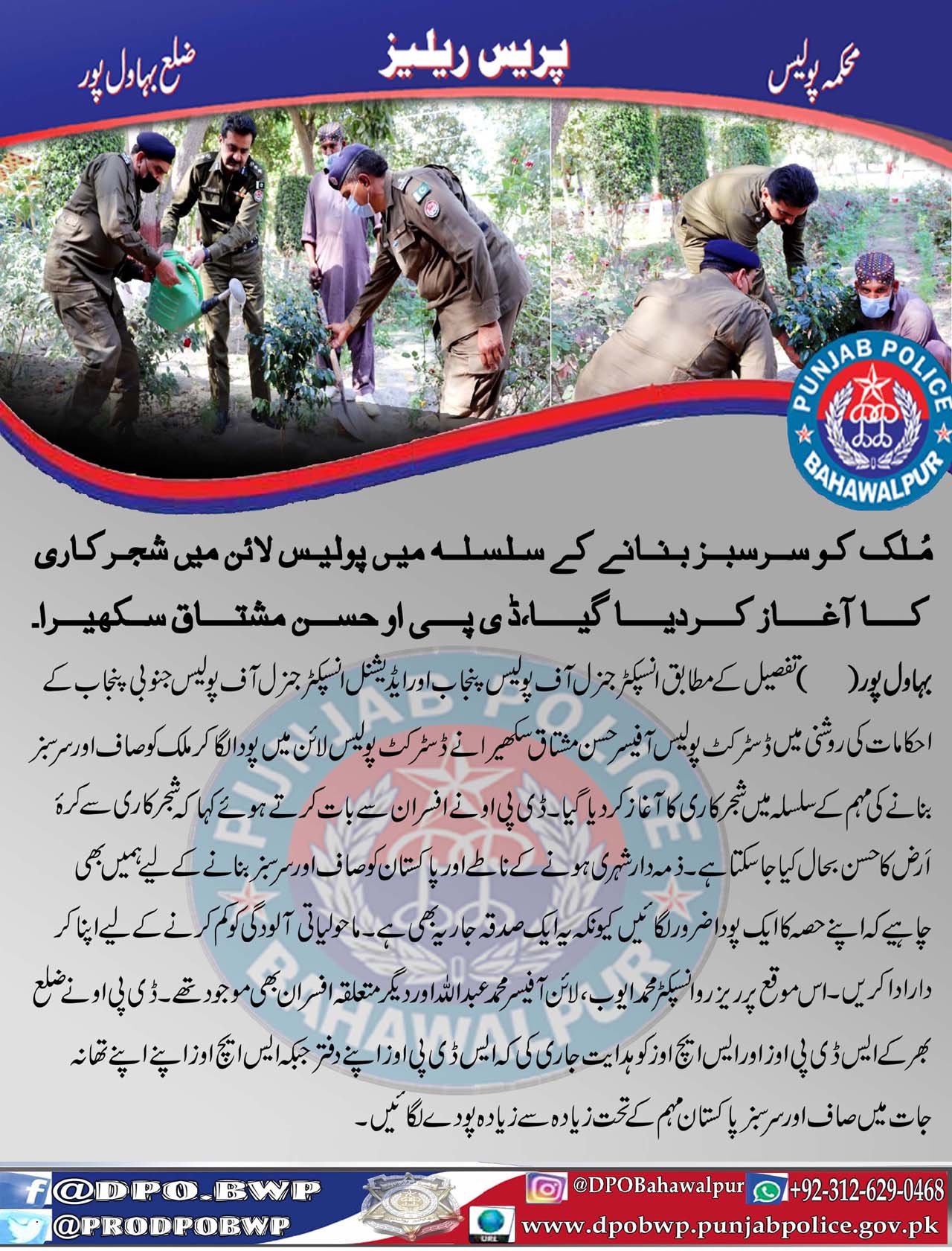 مُلک کو سر سبز بنانے کے سلسلہ میں پولیس لائن میں شجر کاری کا آغاز کردیا گیا، ڈی پی او حسن مشتاق سکھیرا۔
