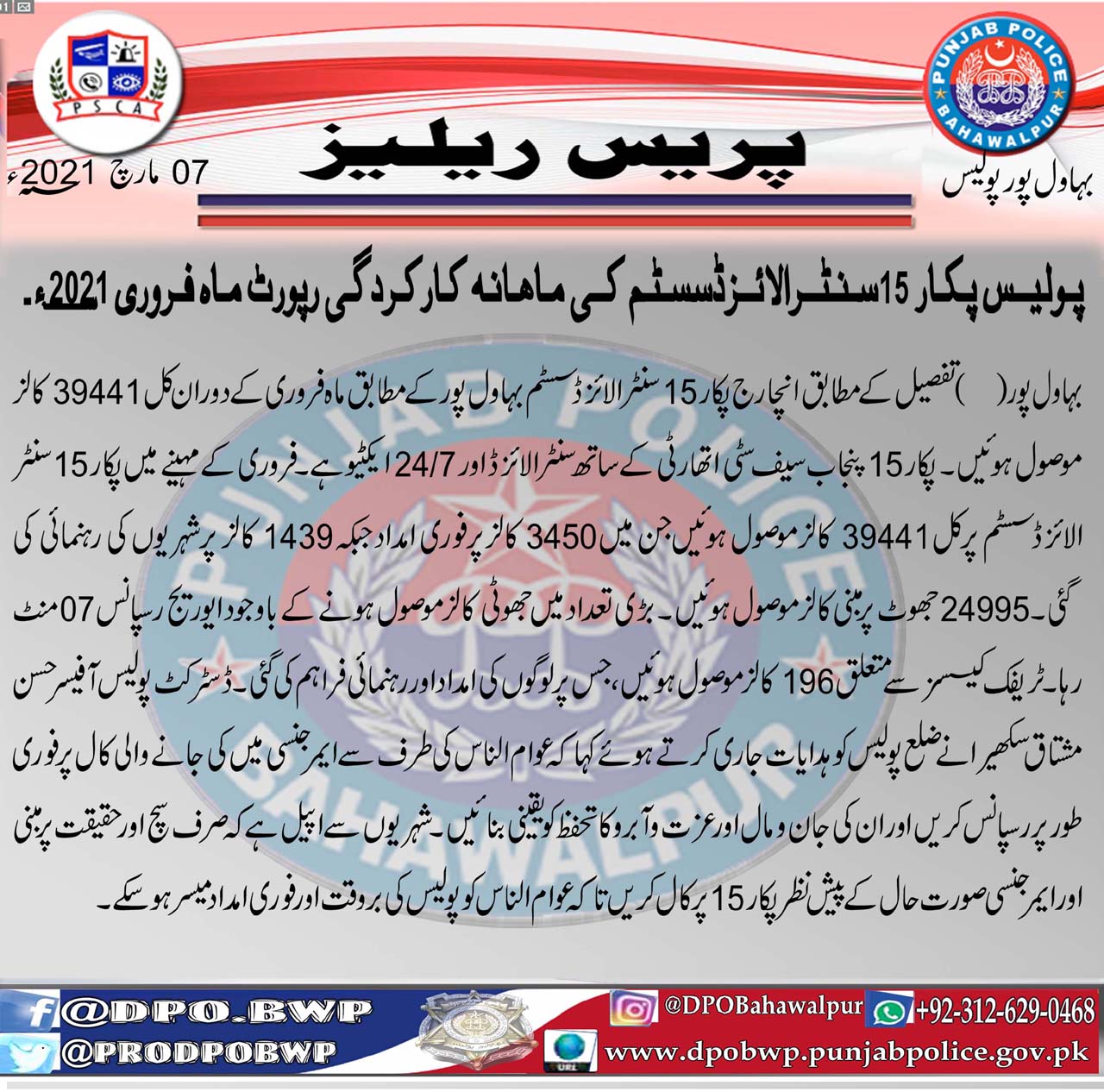 پکار 15 سنٹرالائزڈ سسٹم کی ماہانہ کاکردگی رپورٹ بابت ماہ فروری 2021 جاری