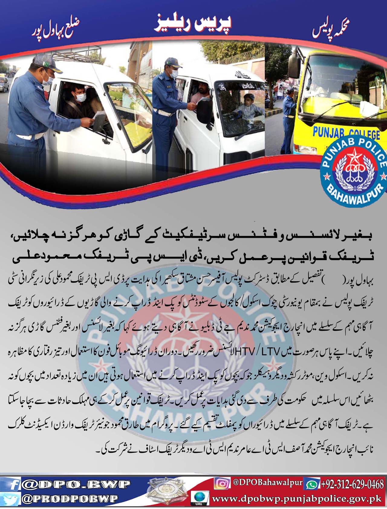 بغیر لائسنس و فٹنس سرٹیفکیٹ کے گاڑی کو ہرگز نہ چلائیں، ٹریفک قوانین پر عمل کریں ، ڈی ایس پی ٹریفک محمود علی۔