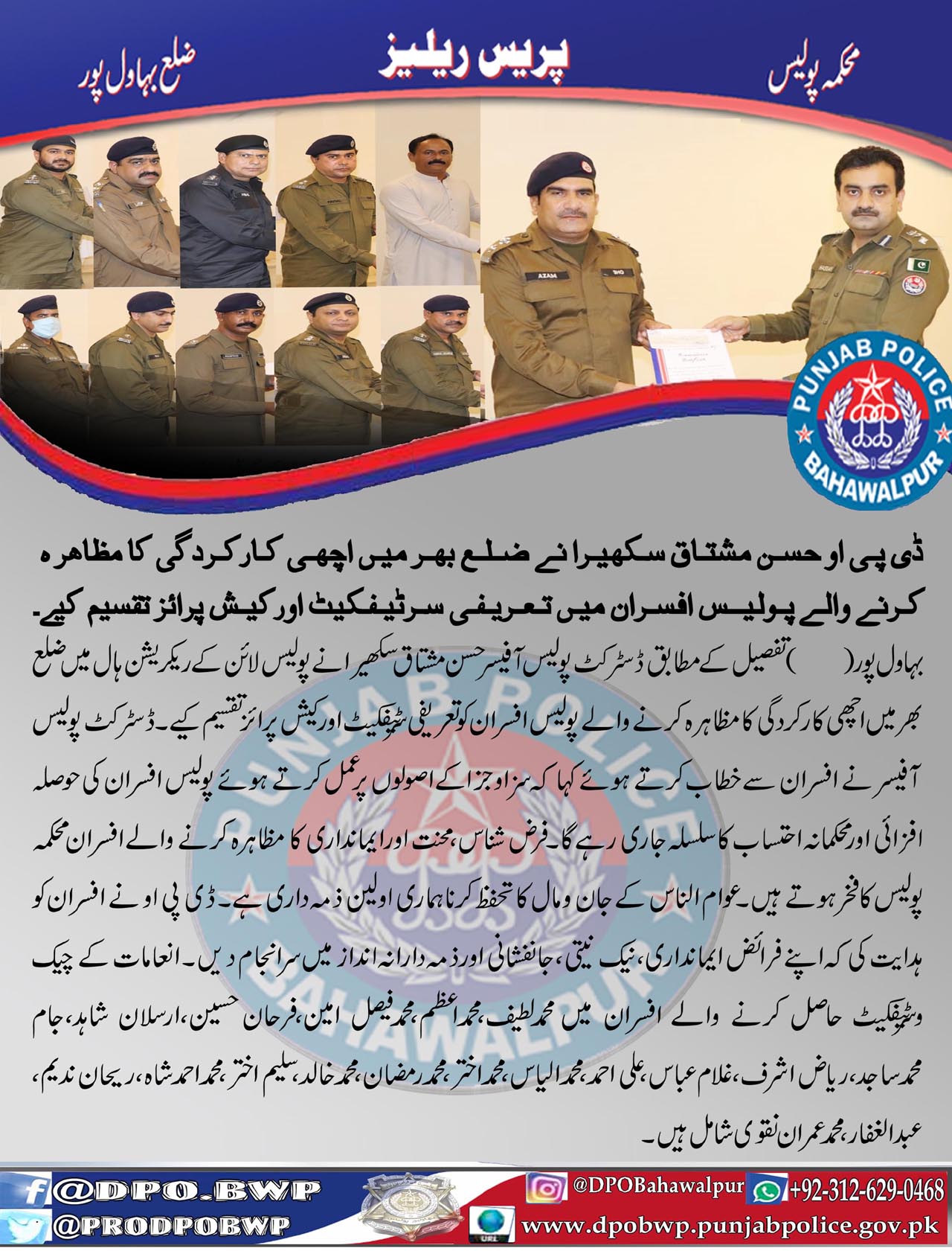 ڈی پی او حسن مشتاق سکھیرا نے ضلع بھر میں اچھی کارکردگی کا مظاہرہ کرنے والے پولیس افسران میں تعریفی سرٹیفکیٹ اور کیش پرائز تقسیم کیے۔