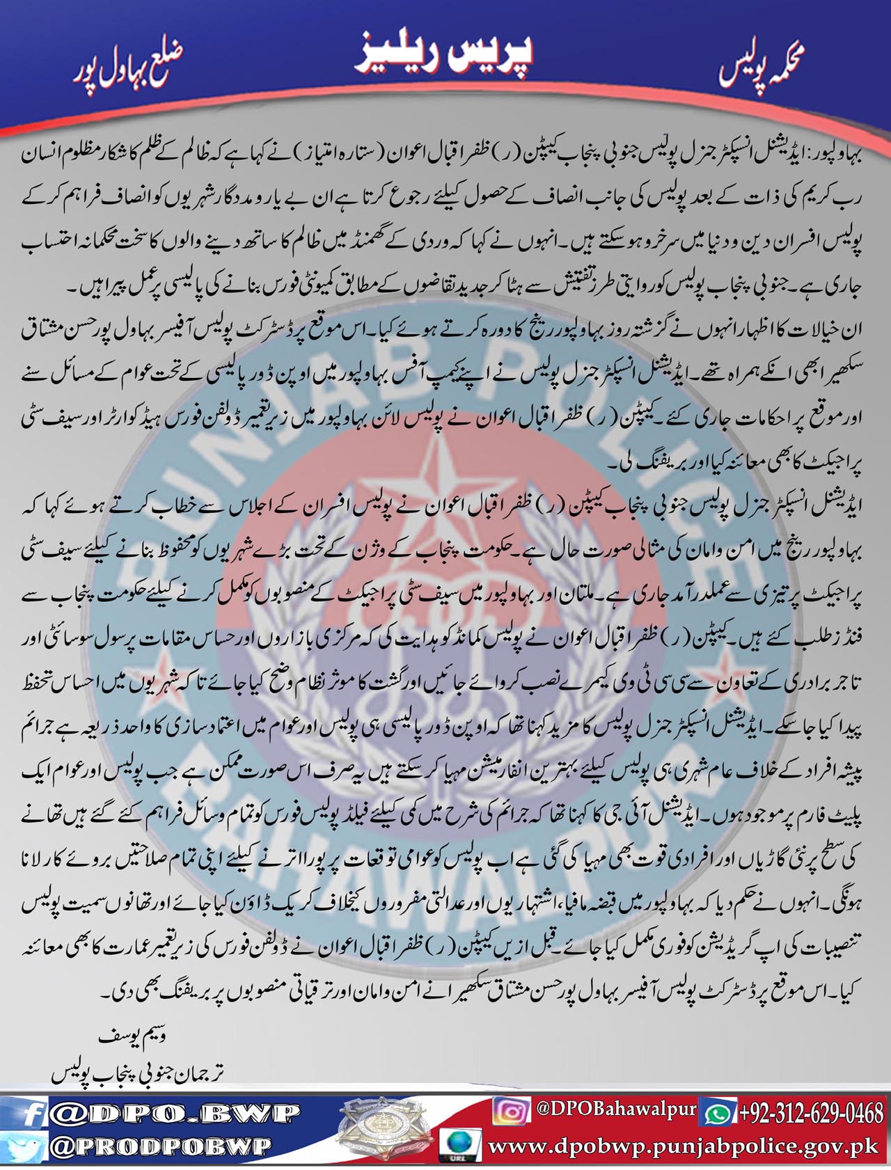 ایڈیشنل انسپکٹر جنرل پولیس جنوبی پنجاب کیپٹن (ر) ظفر اقبال اعوال نے اوپن ڈور پالیسی کے تحت سائلین کے مسائل سنے اور احکامات جاری کیے
