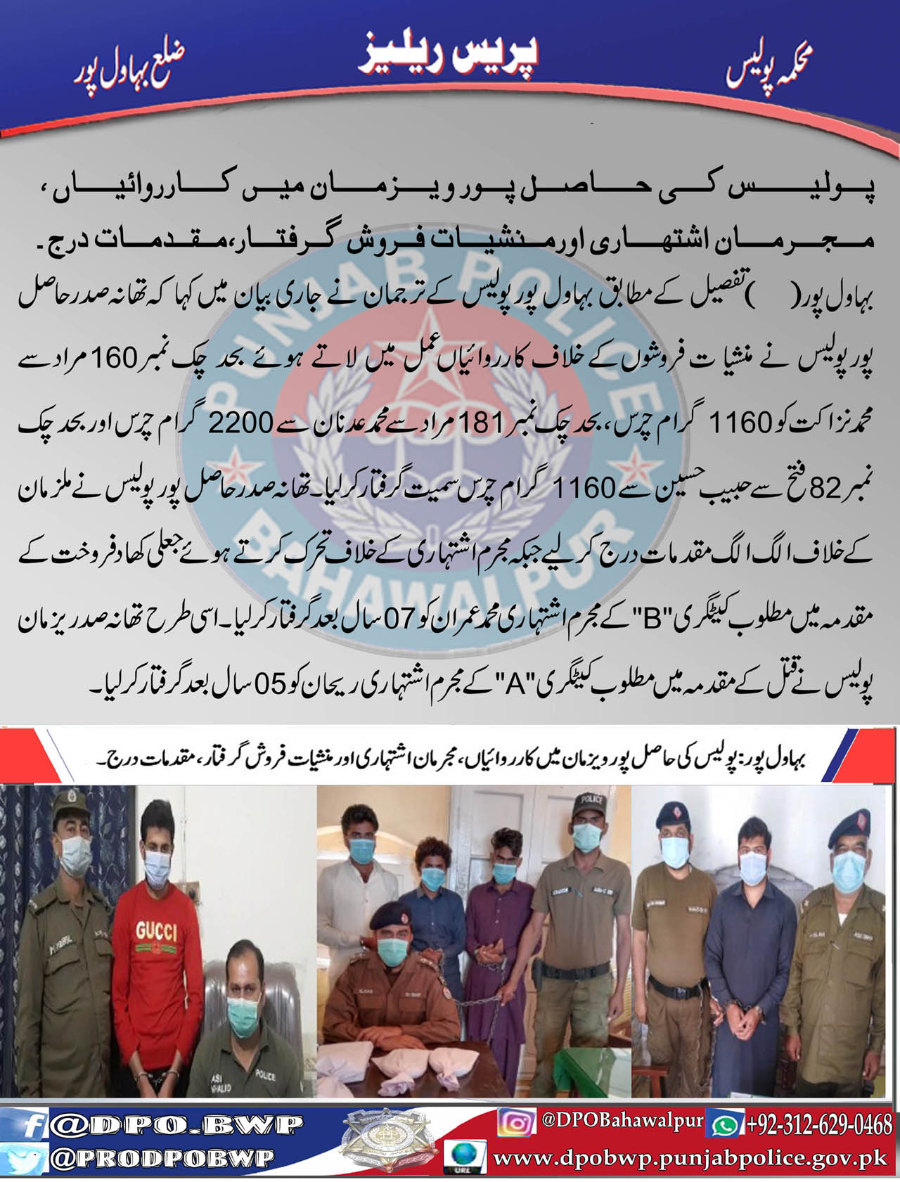 پولیس کی حاصل پور و یزمان میں کارروائیاں، مجرمان اشتہاری اور منشیات فروش گرفتار، مقدمات درج۔