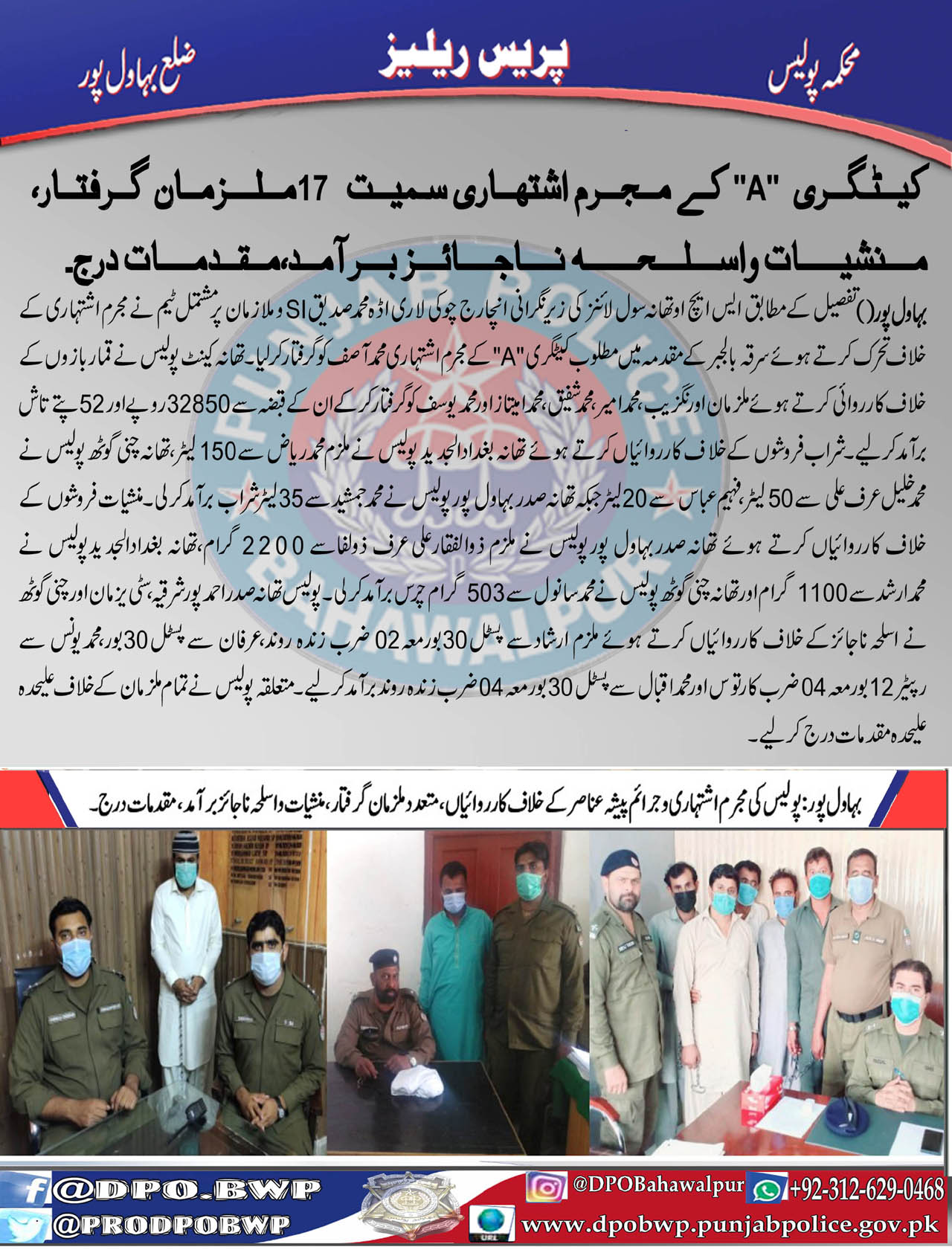 کیٹگری اے کے مجرم اشتہاری سمیت 17ملزمان گرفتار، منشیات و اسلحہ ناجائز برآمد ، مقدمات درج۔