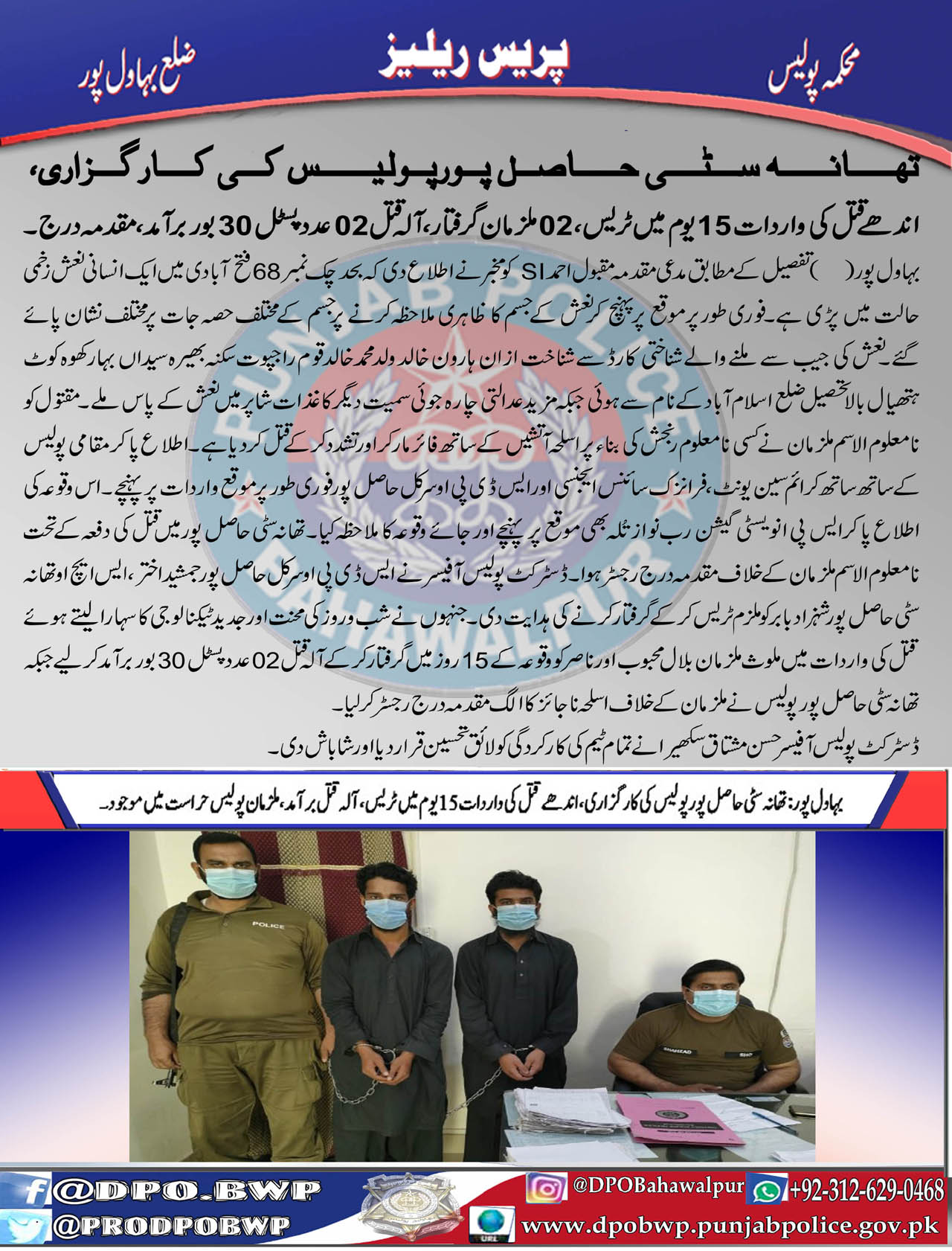 تھانہ سٹی حاصل پور پولیس کی کارگزاری، اندھے قتل کی واردات 15یوم میں ٹریس ، 02ملزمان گرفتار، آلہ قتل 02پسٹل برآمد، مقدمہ درج