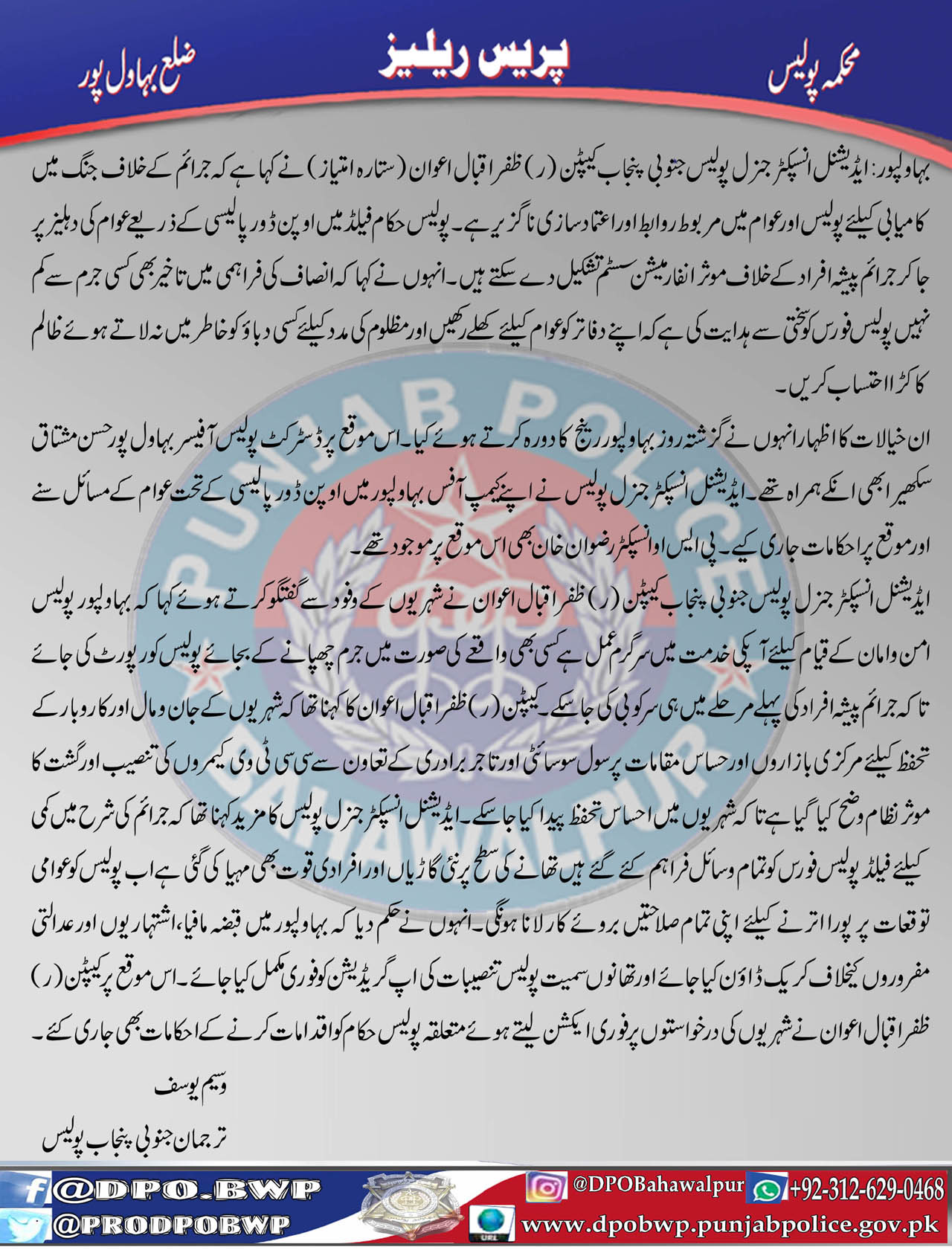 جرائم کے خلاف جنگ میں کامیابی کے لیے پولیس اور عوام میں مربوط روابط اور اعتماد سازی ناگزیر ہے ، ایڈشنل انسپکٹر جنرل پولیس جنوبی پنجاب کیپٹن (ر) ظفر اقبال اعوان۔