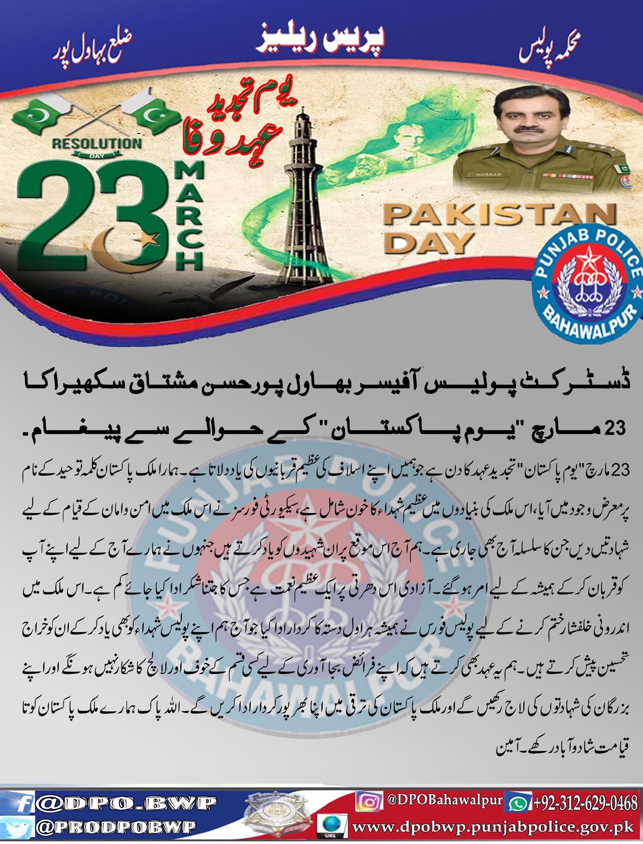 ڈسٹرکٹ پولیس آفیسر بہاول پور حسن مشتاق سکھیرا کا 23 مارچ یوم پاکستان کے حوالے سے پیغام ۔