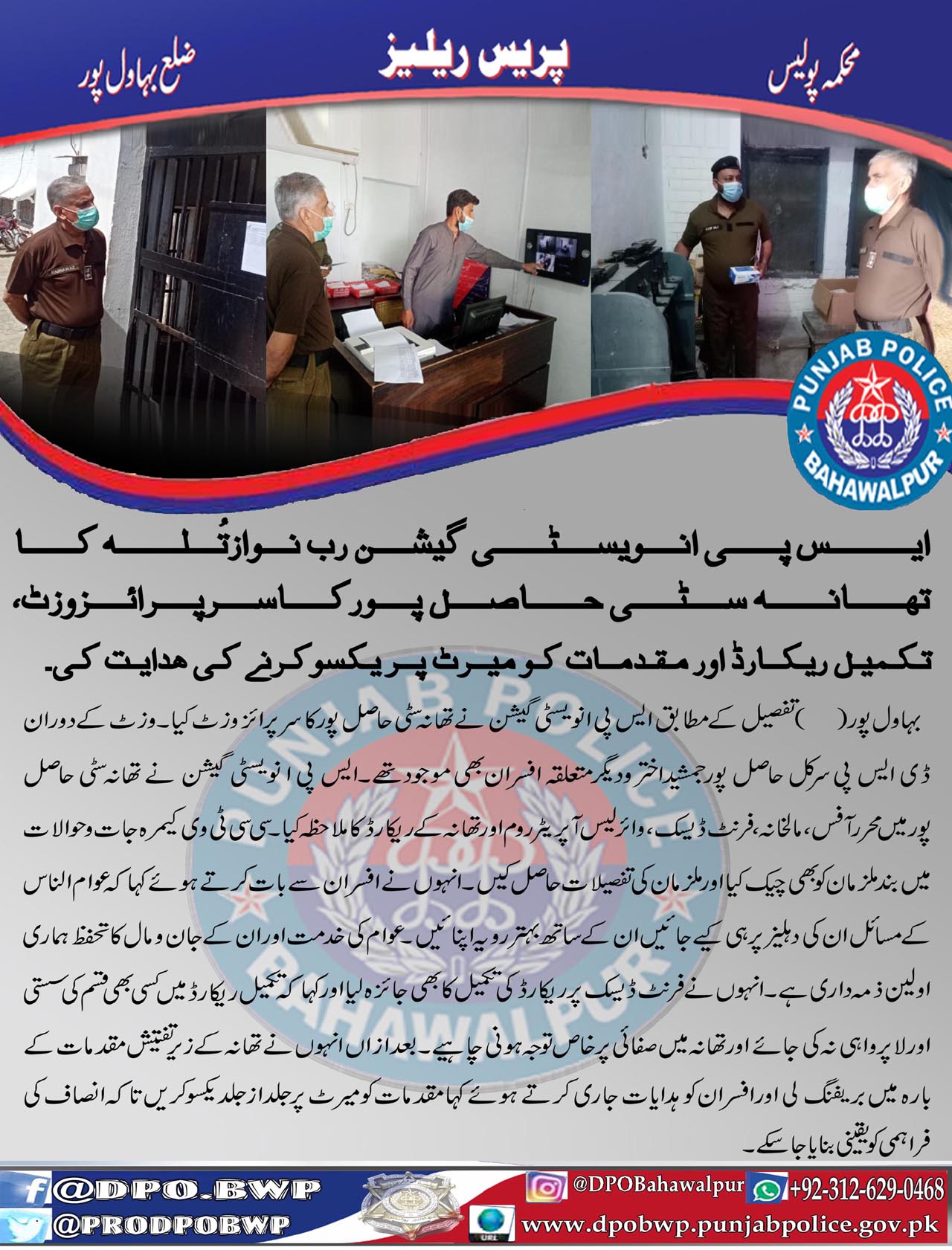 ایس پی انوسٹی گیشن رب نواز تُلہ کا تھانہ سٹی حاصل پور کا سرپرائزوزٹ ، تکمیل ریکارڈ اور مقدمات کو میرٹ پر یکسو کرنے کی ہدایت کی۔
