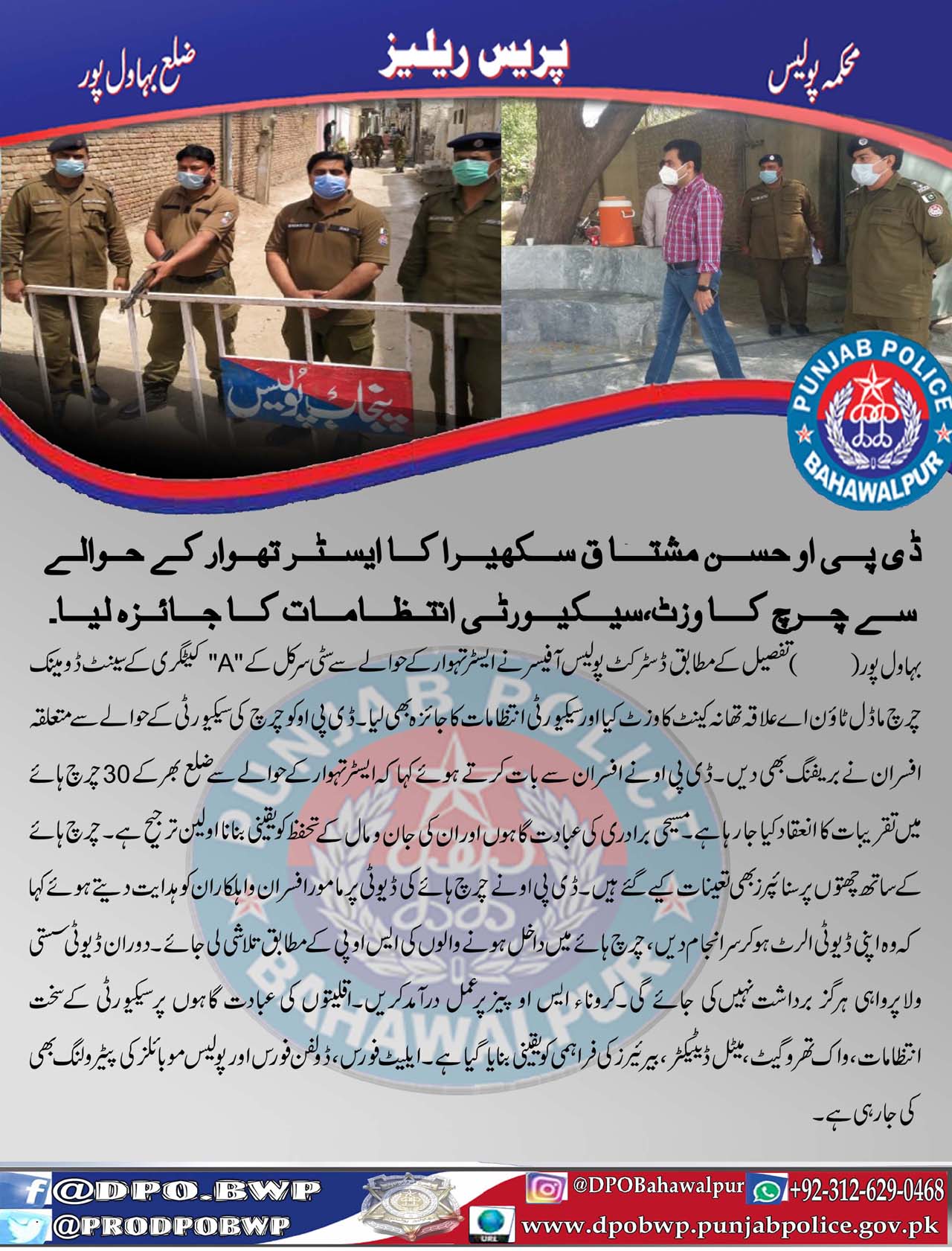 ڈی پی او حسن مشتاق سکھیرا کا ایسٹر تہوار کے حوالے سے چرچ کا وزٹ ، سیکیورٹی انتظامات کا جائزہ لیا۔
