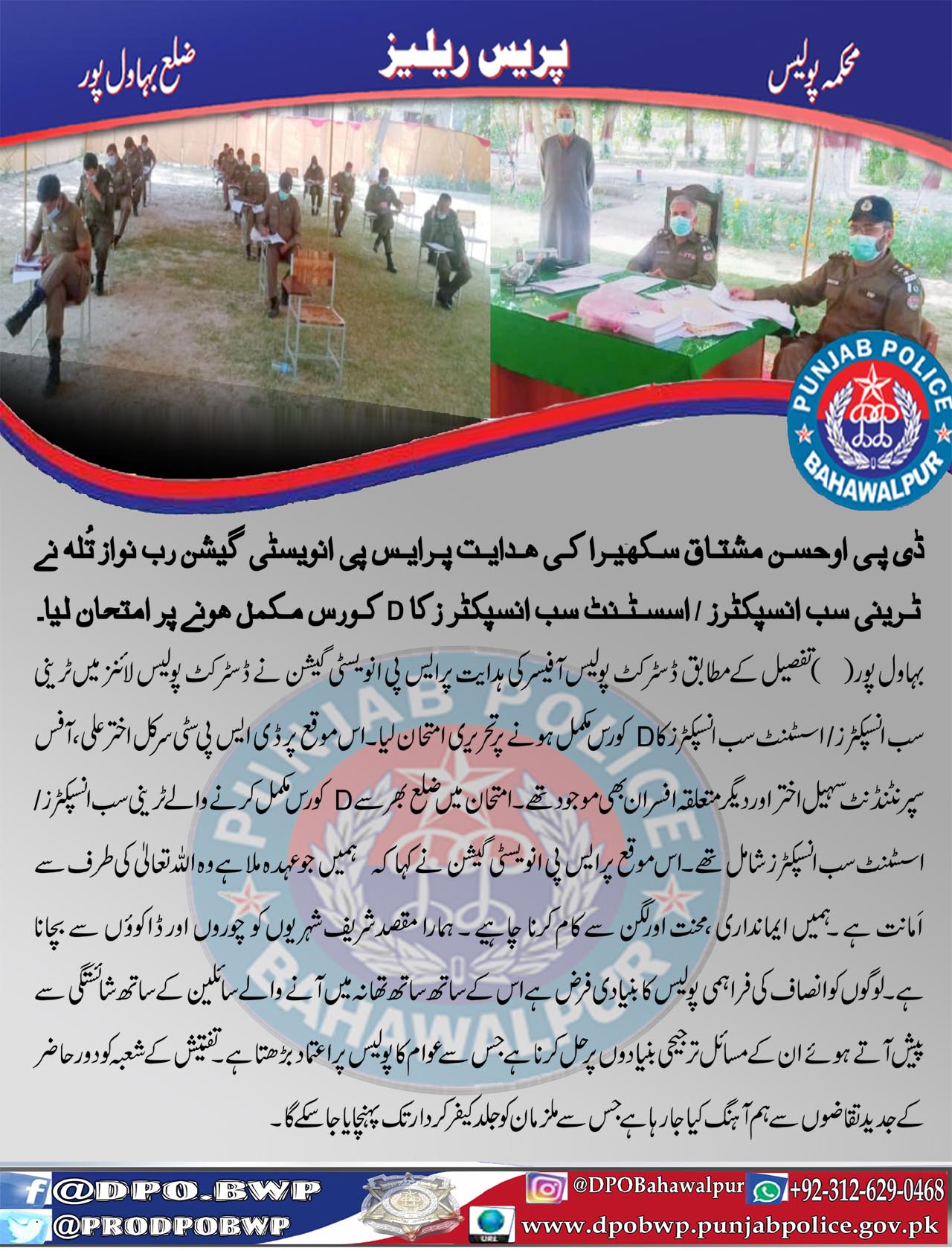 ڈی پی او حسن مشتاق سکھیرا کی ہدایت پر ایس پی انویسٹی گیشن رب نواز تُلہ نے ٹرینی سب انسپکٹرز /اسسٹنٹ سب انسپکٹرز کا ڈی کورس مکمل ہونے امتحان لیا۔