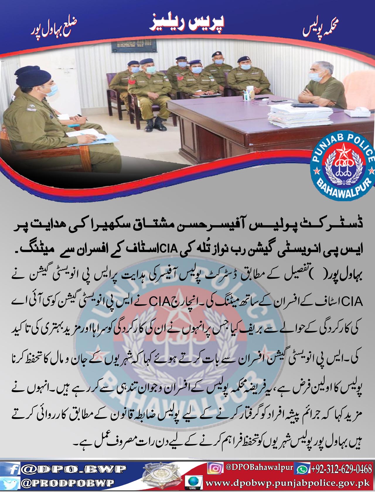 ڈسٹرکٹ پولیس آفیسر حسن مشتاق سکھیرا کی ہدایت پر ایس پی انویسٹی گیشن رب نواز تُلہ کی سی ۔آئی۔اے اسٹاف کے افسران سے میٹنگ۔۔