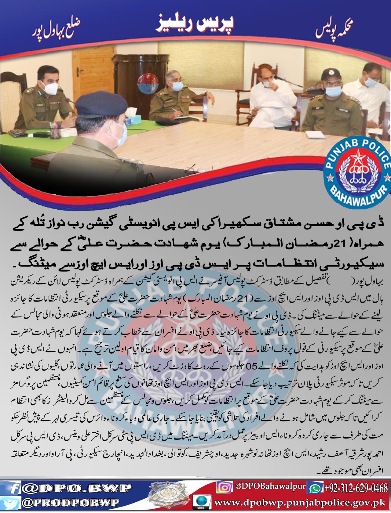 ڈی پی او حسن مشتاق سکھیرا کی ایس پی انوسٹی گیشن رب نواز تُلہ کے ہمراہ (21رمضان المبارک)یوم شہادت حضرت علی کے حوالے سے سیکیورٹی انتظامات پر ایس ڈی پی اوز اور ایس ایچ اوز سے میٹنگ۔