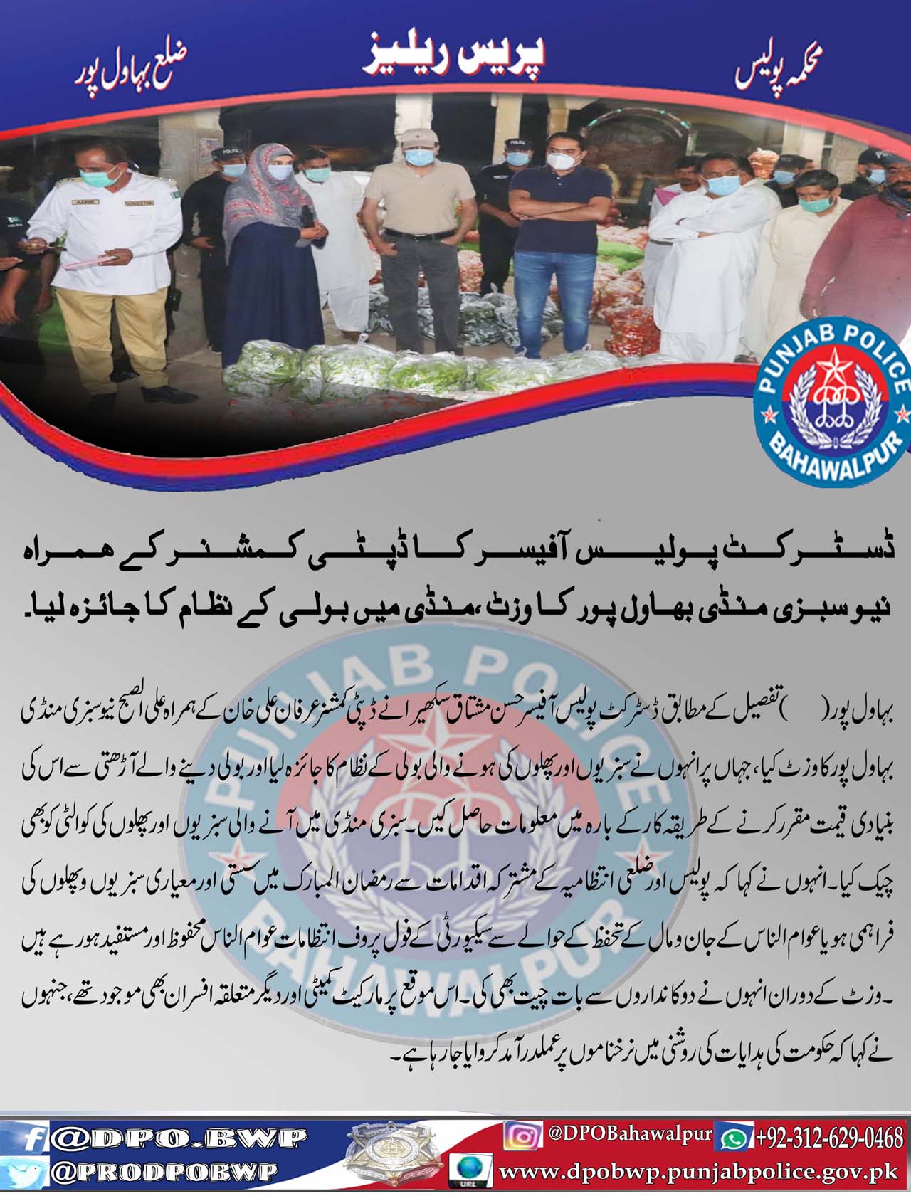 ڈسٹرکٹ پولیس آفیسر کا ڈپٹی کمشنر کے ہمراہ نیوسبزی منڈی بہاول پور کا وزٹ ، منڈی میں بولی کے نظام کا جائزہ لیا۔