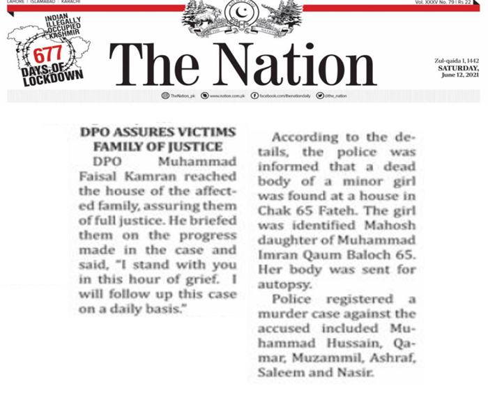 DPO Muhammad Faisal Kamran reached the house of the affected family, assuring them of full justice. He briefed them on the progress made in the case and said, “I stand with you in this hour of grief. I will follow up this case on a daily basis.”