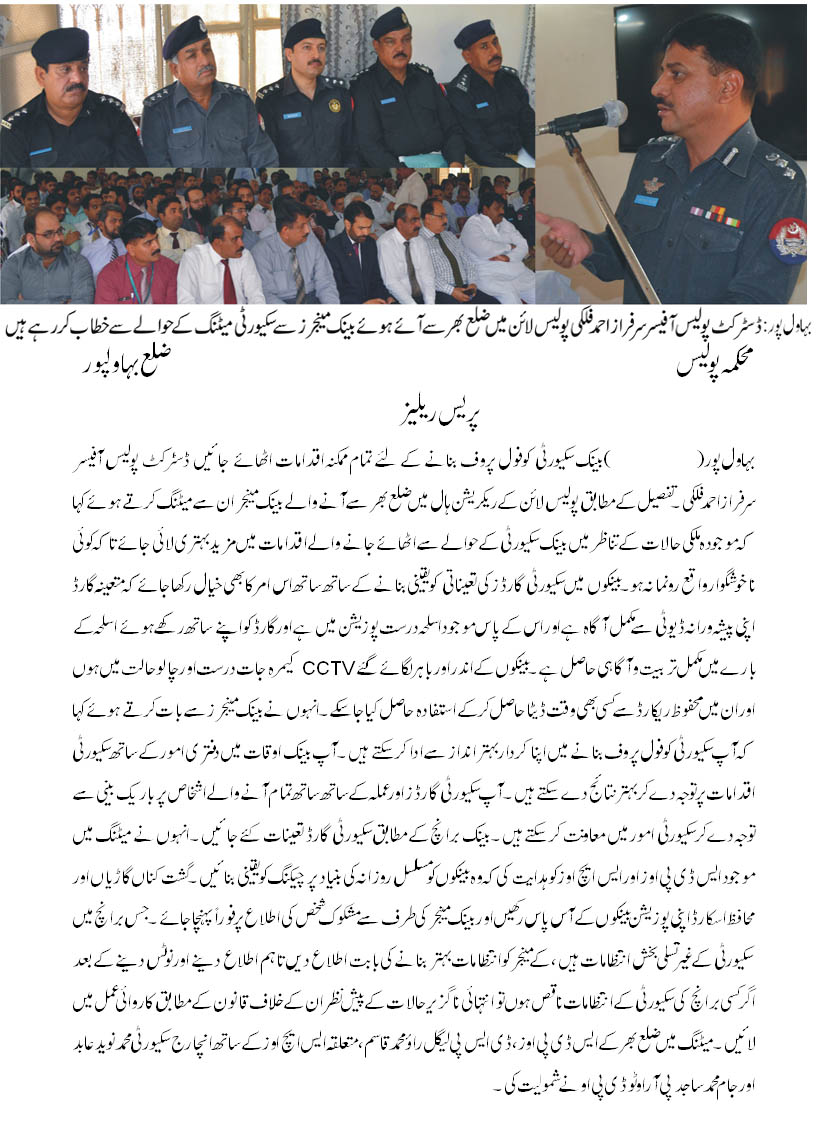 The district police officer met bank managers from the district for a meeting on Thursday at the Bahawalpur Police Lines Recreation Hall. There, he assured them that the police would take all possible steps to provide tight security to the banks, DPO Sarfraz Ahmad Falki said.