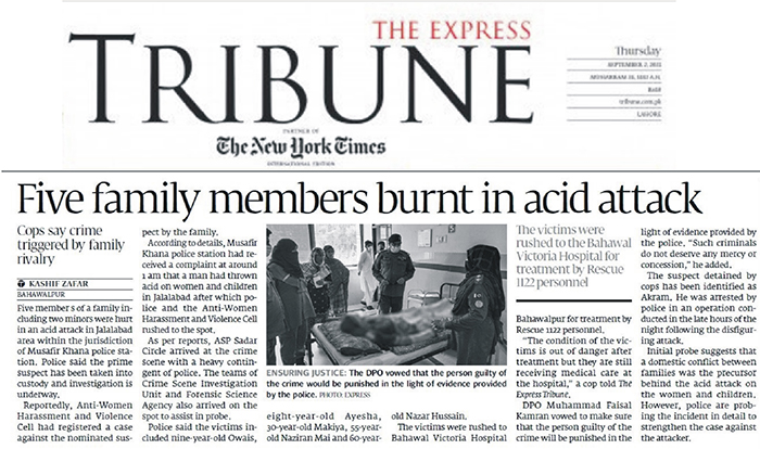 Five member s of a family including two minors were hurt in an acid attack in Jalalabad area within the jurisdiction of Musafir Khana police station. Police said the prime suspect has been taken into custody and investigation is underway.
