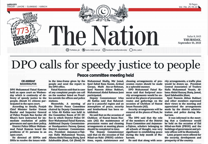 The DPO said that the role of the members of the District Peace Committee and Anjuman-e-Tajiran, scholars belonging to all schools of thought, was very significant in establishing peace during the holy month of Muharram.