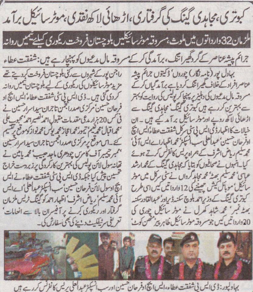 کبوتری، مجاہدی گینگ کی گرفتاری، اڑھائی لاکھ نقدی اور موٹر سائیکل برآمد