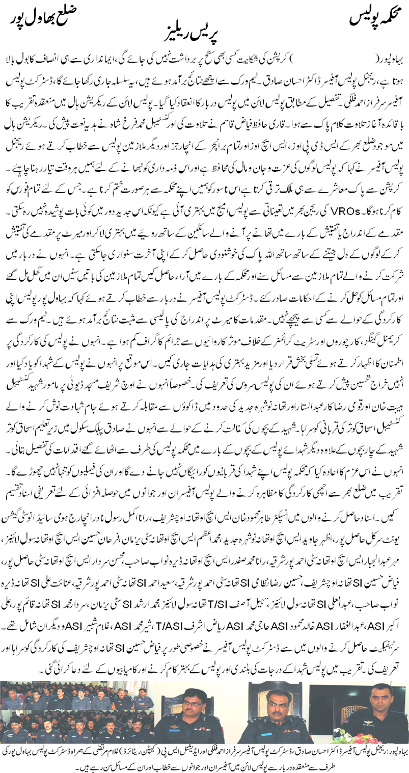 ۔پولیس لائن بھاولپور میں پولیس دربار کا انقعاد :پریس ریلیز