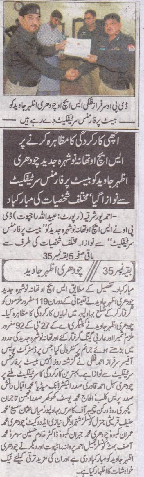 اچھی کارکردگی کا مظاہرہ کرنے پر ایس ایچ او تھانہ نوشہرا جدید چوہدری اظہر جاوید کو بیسٹ پرفارمنس سرٹیفیکٹ سے نواز ا گیا
