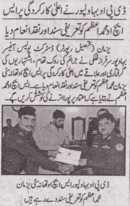 ۔ڈی پی او بہاولپور نے اعلی کارکردگی پر ایس ایچ او محمد اعظم تھانہ سٹی یزمان کو تعریفی سند اور نقد انعام دیا۔