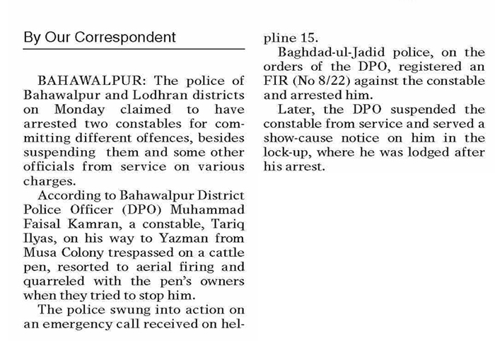 Baghdad-ul-Jadid police, on the orders of the DPO, registered an FIR (No 8/22) against the constable and arrested him.