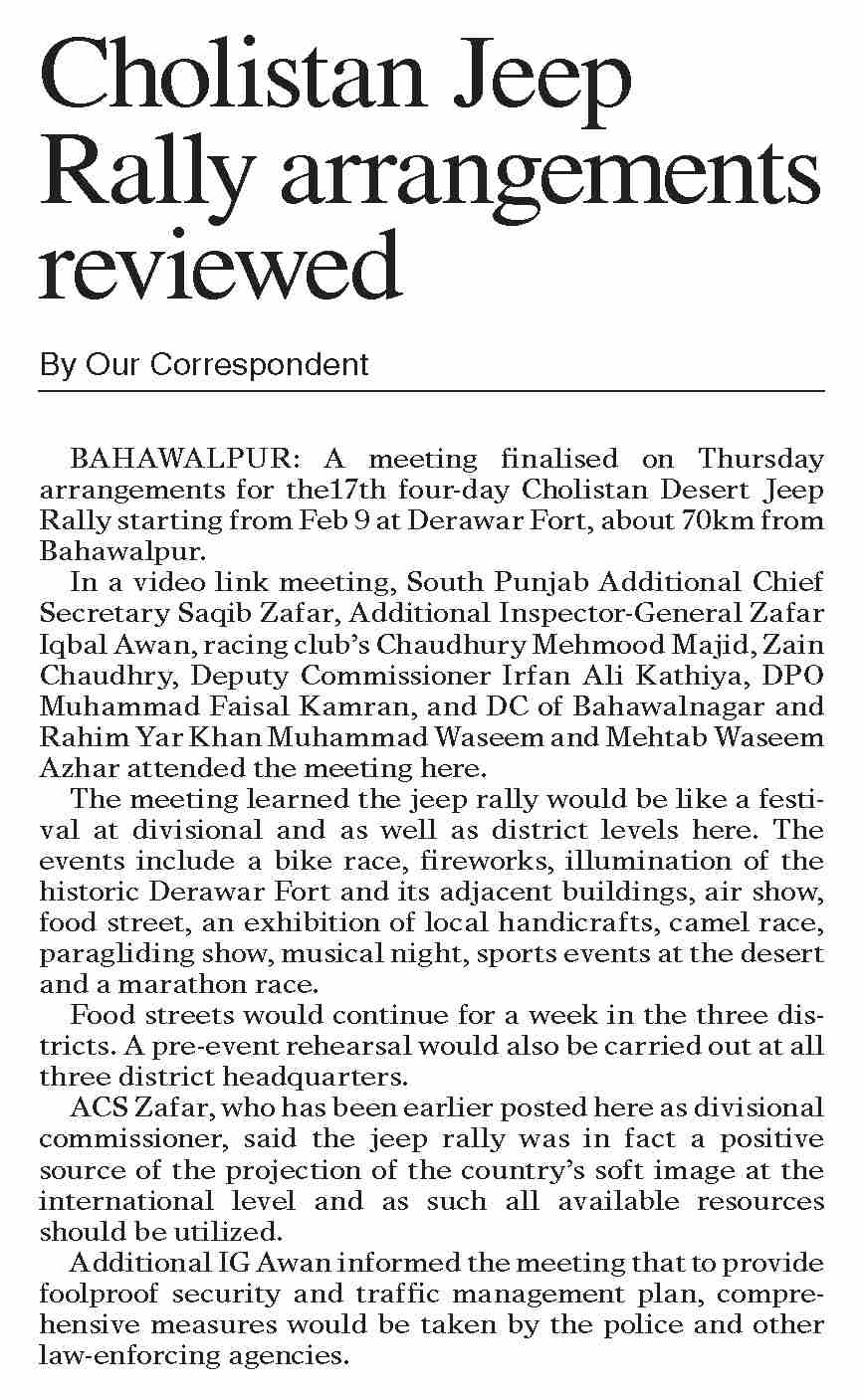 BAHAWALPUR: A meeting finalised on Thursday arrangements for the17th four-day Cholistan Desert Jeep Rally starting from Feb 9 at Derawar Fort, about 70km from Bahawalpur.