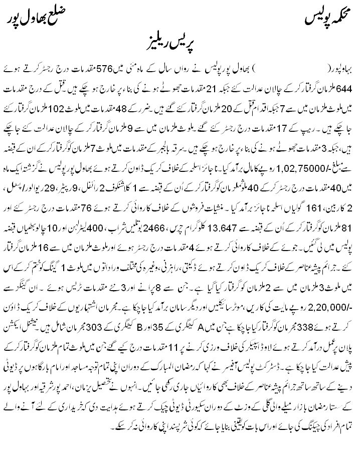 Bahawalpur Police Performance of May 2016
