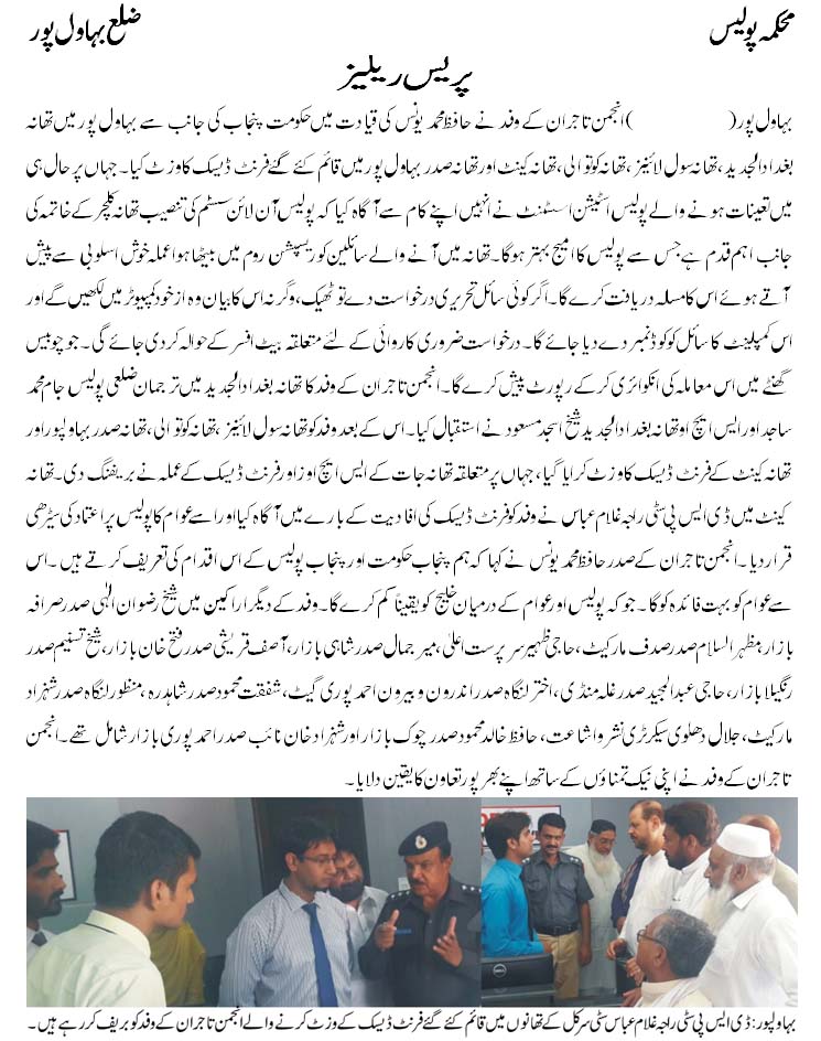 Press Releasss ڈی ایس پی سٹی راجہ غلام عباس نےانجمن تاجران بہاولپور کو سٹی کے تمام تھانوں کے فرنٹ ڈیسک کا وزٹ کروایا اور بریفنگ دی
