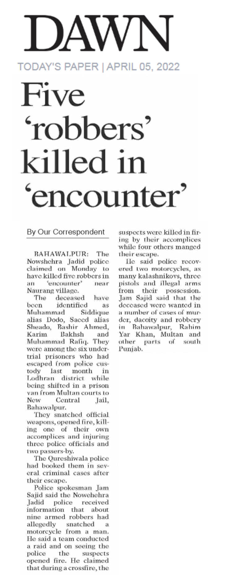 BAHAWALPUR: The Nowshehra Jadid police claimed on Monday to have killed five robbers in an ‘encounter’ near Naurang village.