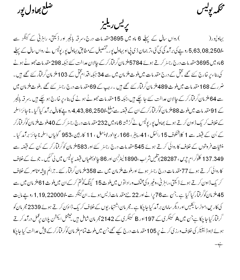 گزشتہ چھ ماہ میں بہاولپور پولیس کی کارکردگی پریس ریلیز