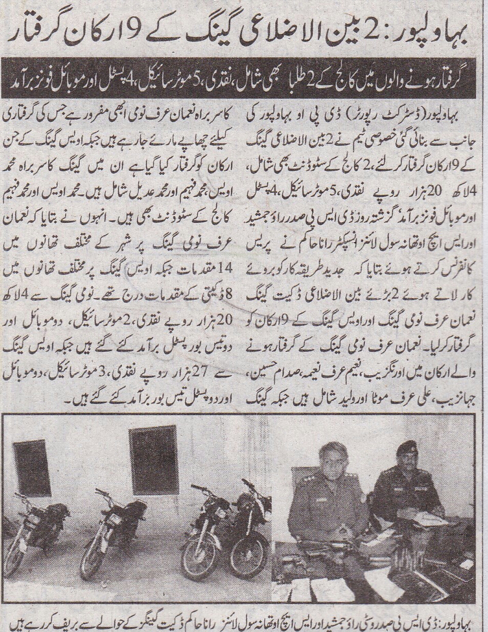 ۔دو بین الضلاعی گینگ 9 اراکان گرفتار نقدی ،5موٹرسائیکل ،4پسٹل اور موبائل فون برآمد