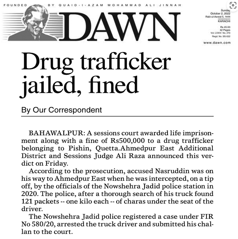 According to the prosecution, accused Nasruddin was on his way to Ahmedpur East when he was intercepted, on a tip off, by the officials of the Nowshehra Jadid police station in 2020. The police, after a thorough search of his truck found 121 packets - - one kilo each -- of charas under the seat of the driver.