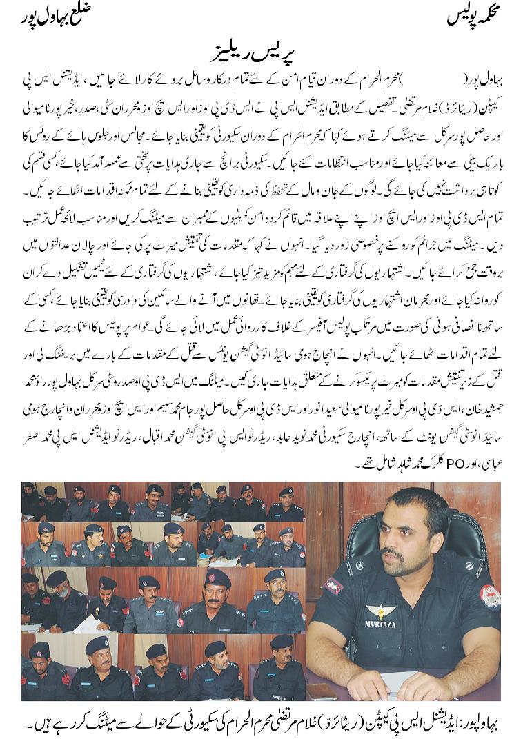محرم الحرام کے دوران قیام امن کے لیے تمام درکار وسائل بروئے کار لائے جائیں ۔ ایڈیشنل ایس پی (کیپٹن ریٹائرڈ )غلام مرتضیٰ ۔ ایس ڈی پی اوز و ایس ایچ اوز اور محرران سٹی، صدر ،خیرپور ٹامیوالی اور حاصل پور سرکل سے میٹنگ