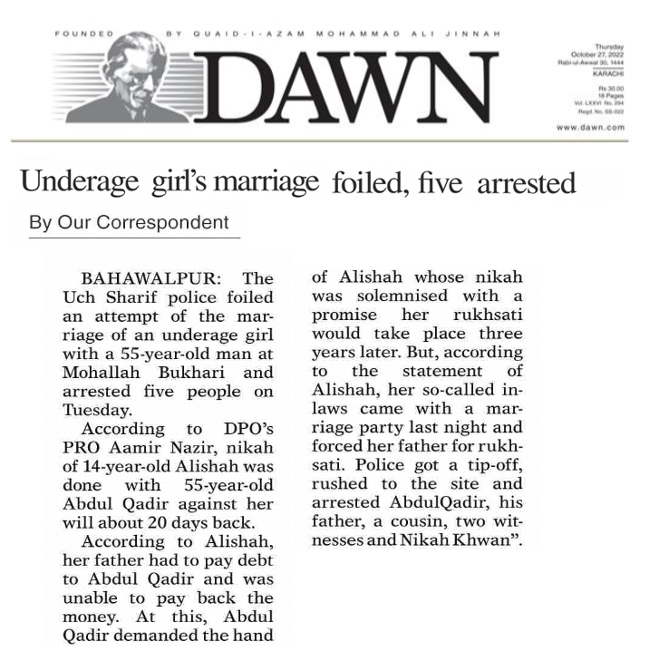According to Alishah, her father had to pay debt to Abdul Qadir and was unable to pay back the money. At this, Abdul Qadir demanded the hand of Alishah whose nikah was solemnised with a promise her rukhsati would take place three years later. But, according to the statement of Alishah, her so-called in-laws came with a marriage party last night and forced her father for rukhsati. Police got a tip-off, rushed to the site and arrested AbdulQadir, his father, a cousin, two witnesses and Nikah Khwan”.