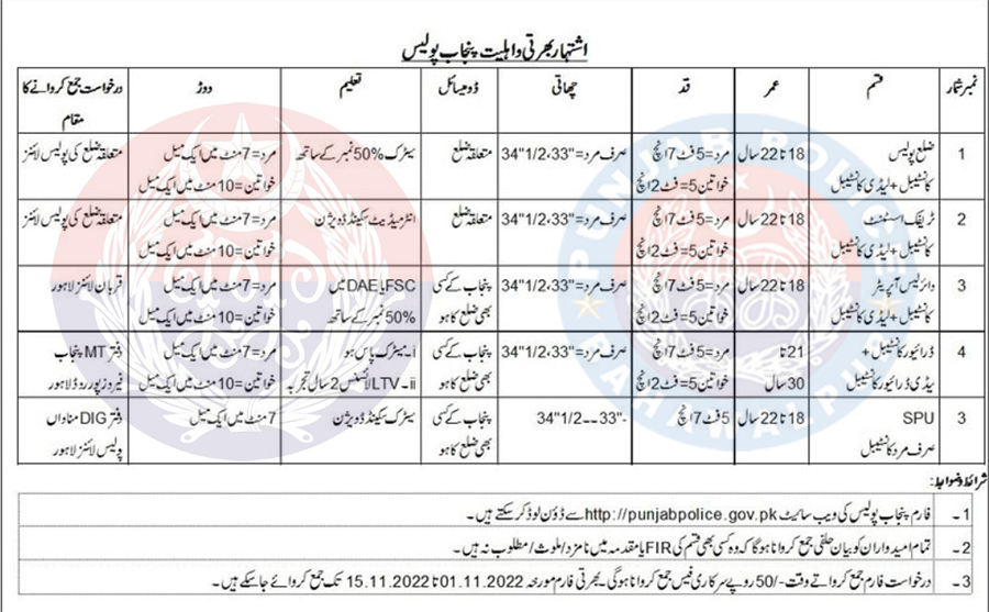 - Driver Constables in Motor Transport,Punjab (Candidates belonging to any district of Punjab will submit the recruitment form at MT Office Punjab Ferozepura Road Lahore.)
